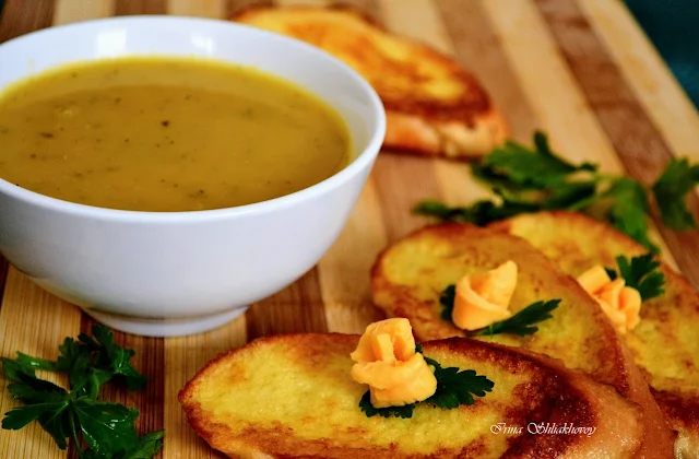 Суп из листьев мангольда и красной чечевицы с гренками и сыром Гауда