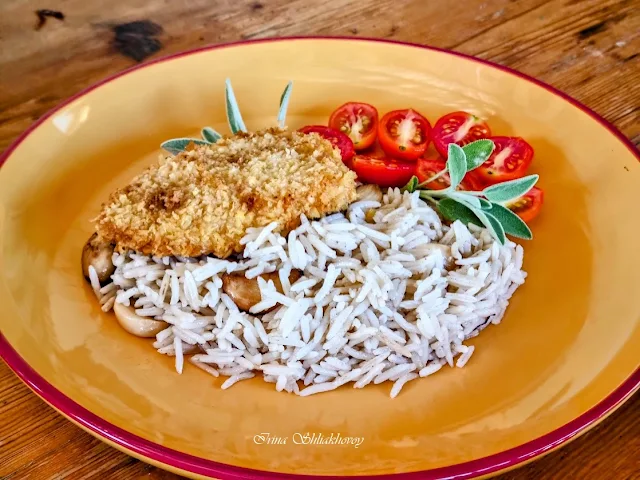 Такой рис может быть прекрасным гарниром к мясу или рыбе. В качестве иллюстрации, фото сделанные накануне с лососем и куриным шницелем. В обоих случаях было очень вкусно.